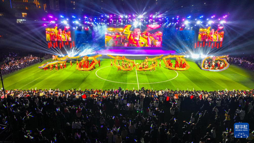 2月12日,“龙耀宣汉·千亿争先”龙舞嘉年华专场活动在四川省宣汉中学运动场举行(无人机照片)。