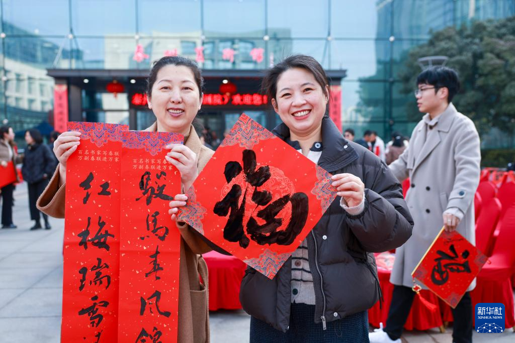 2月13日,在江苏省泰州市美术馆西广场,市民手拿书法家现场书写的福字和春联合影留念。