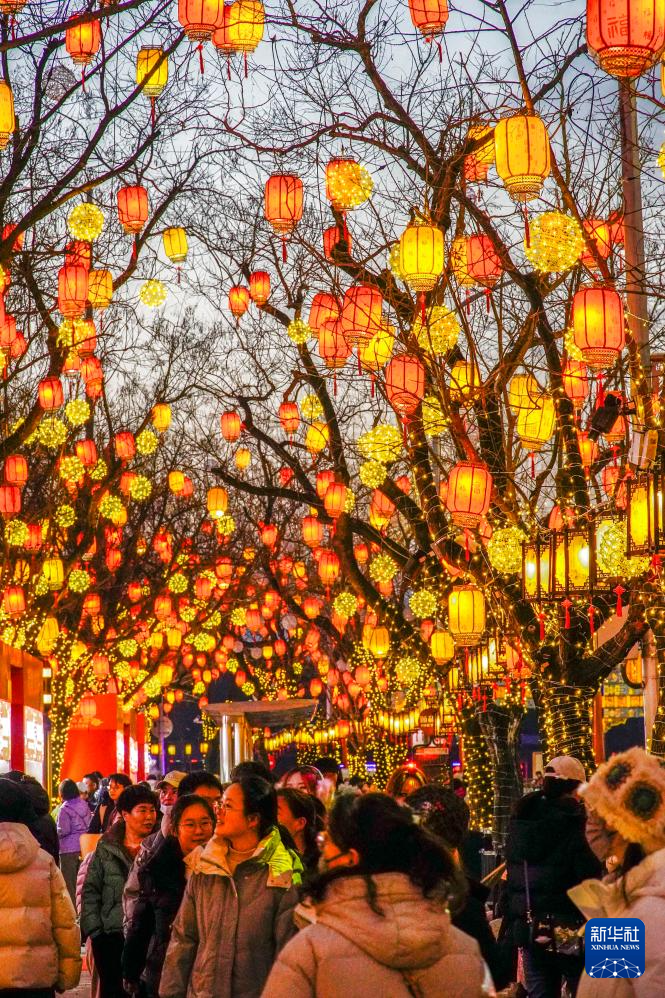 2月12日,人们在彩灯高悬的北京街头游玩赏景。