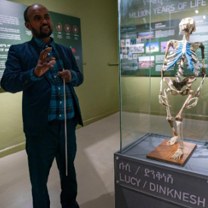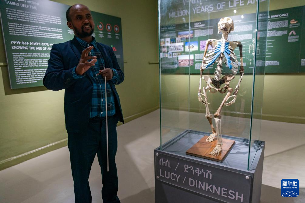 2月12日,在埃塞俄比亚首都亚的斯亚贝巴的埃塞俄比亚国家博物馆内,工作人员讲解露西化石的相关知识。