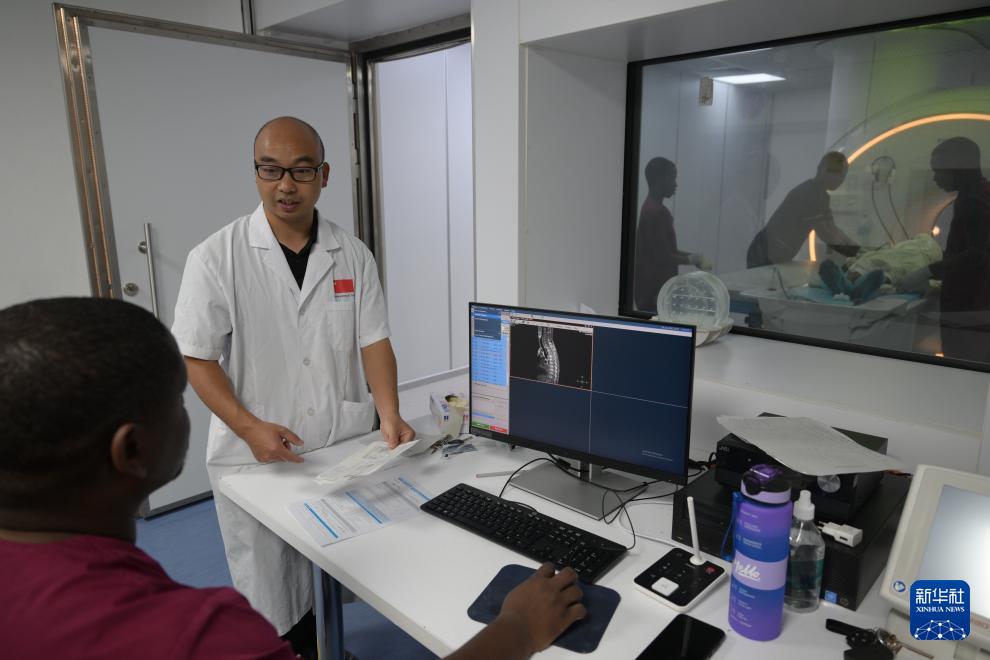 1月29日,在津巴布韦首都哈拉雷的帕里雷尼亚图瓦医院放射科磁共振检查室,第22批中国援津医疗队队长郑兴友与津巴布韦医务人员交流。