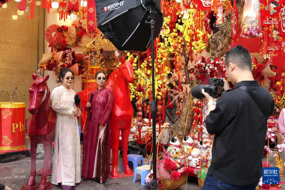 2月13日,在越南首都河内的马市街,两名女子在马年新春装饰前合影留念。