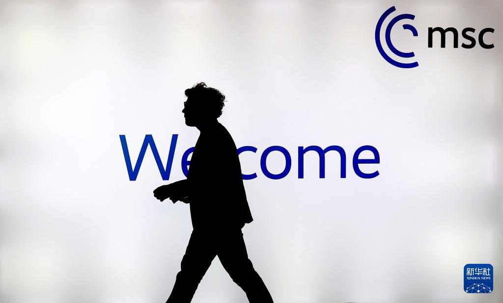 2月13日,在德国慕尼黑,一名男子走过第62届慕尼黑安全会议(慕安会)新闻中心屏幕。