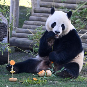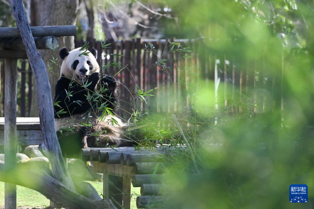 2月14日,大熊猫“茱萸”在西班牙马德里动物园内享用“春节大餐”。