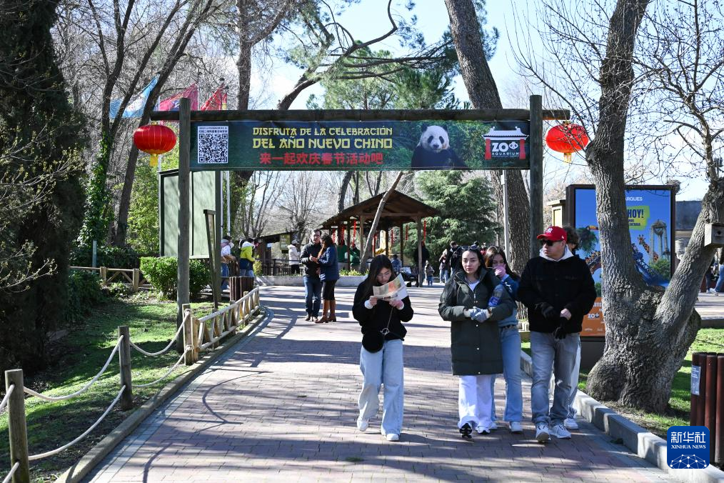 2月14日,游客在西班牙马德里动物园内观看舞狮表演。