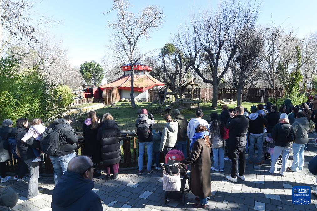 2月14日,游客在西班牙马德里动物园的熊猫馆前驻足。