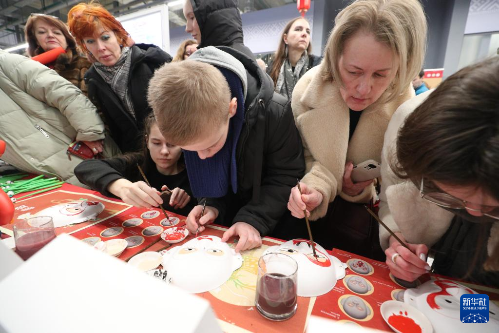 2月14日,在俄罗斯圣彼得堡,当地民众体验剪纸。