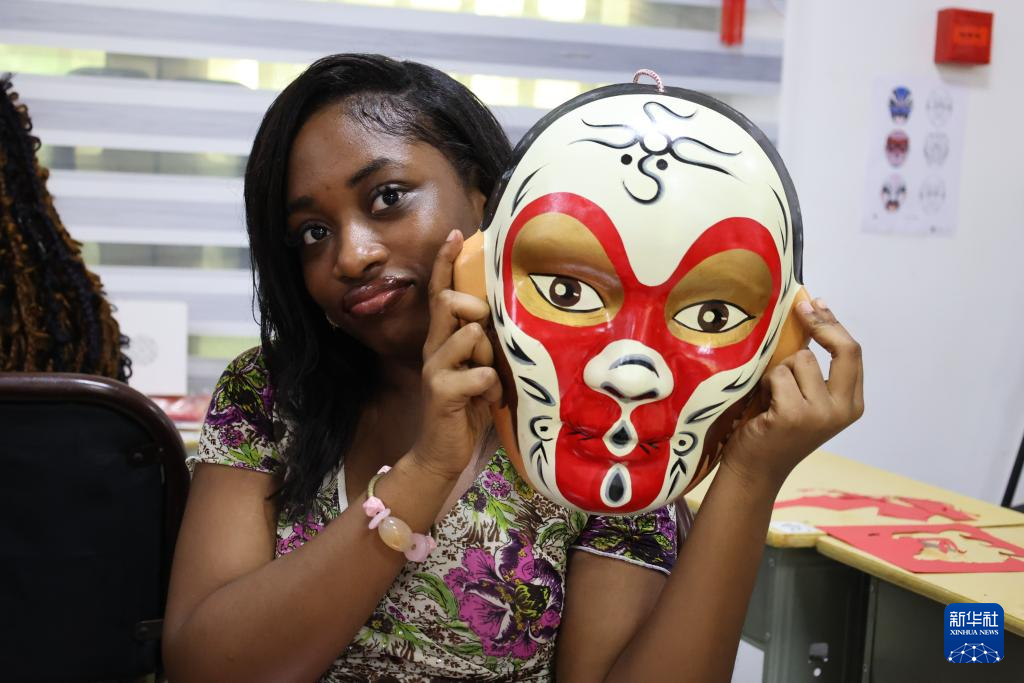 2月13日,在加纳阿克拉,一名学生在加纳大学孔子学院举行的新春游园会上展示中国戏曲脸谱。