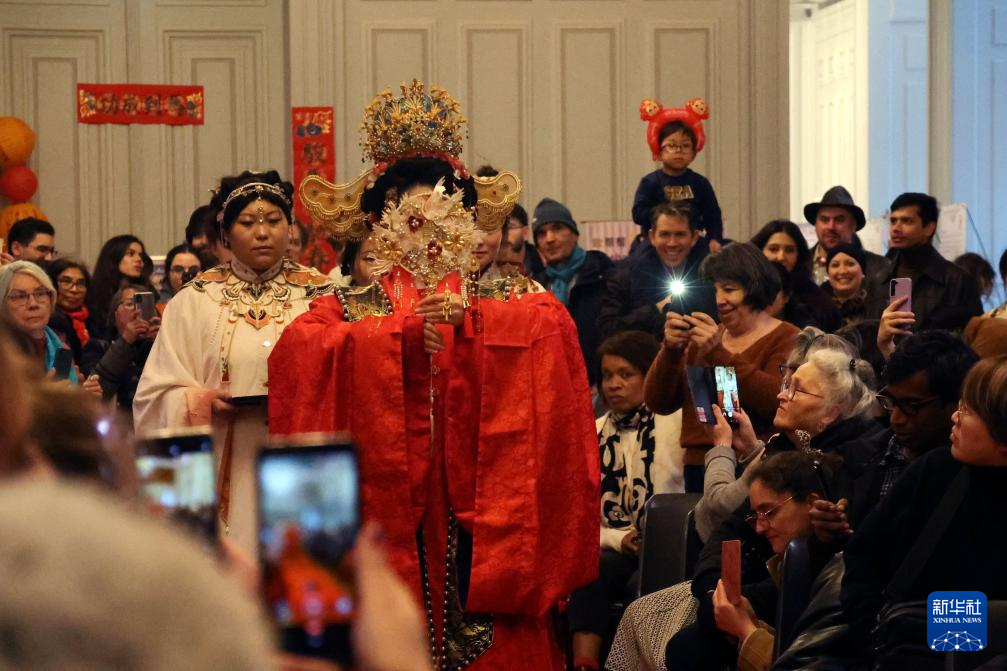2月14日,在法国巴黎举行的2026年法国汉风新春庆典上,演员身穿中国传统服饰,展示古代婚礼。