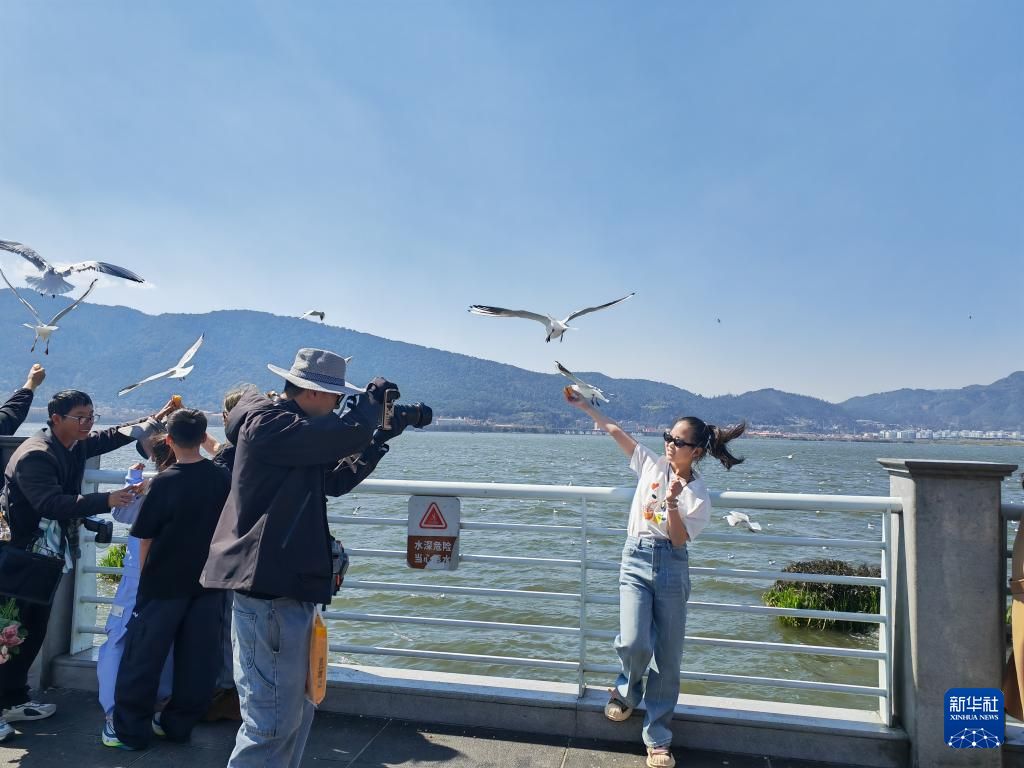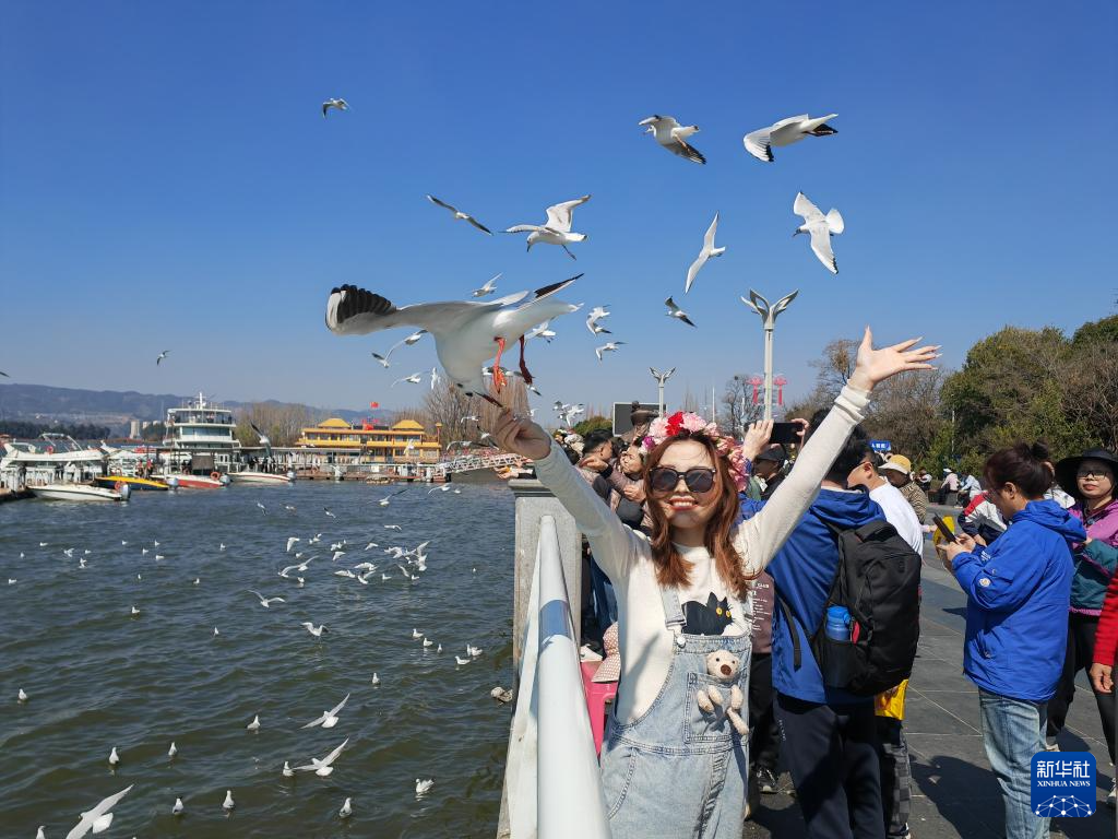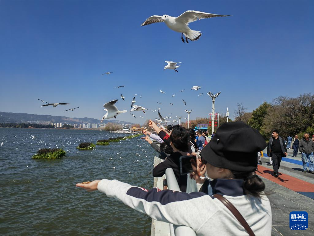2月16日,游客在云南省昆明市海埂大坝喂食红嘴鸥。