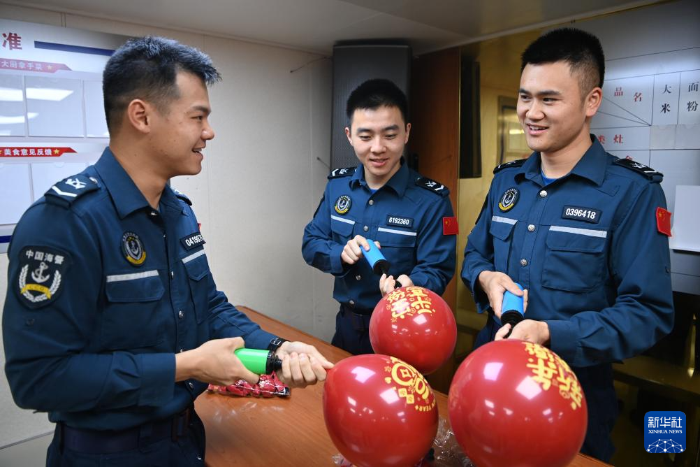 2月11日,中国海警万山舰执法员在准备春节装饰气球。