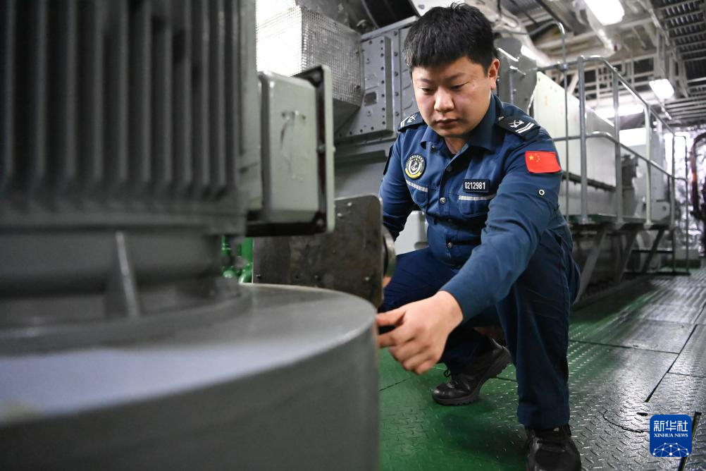 2月12日,中国海警万山舰执法员刘春雨在机舱内检查淡水泵压力。淡水是舰艇航行中最重要的资源,刘春雨需要在高温、高噪音环境中对相关设备进行反复检查。