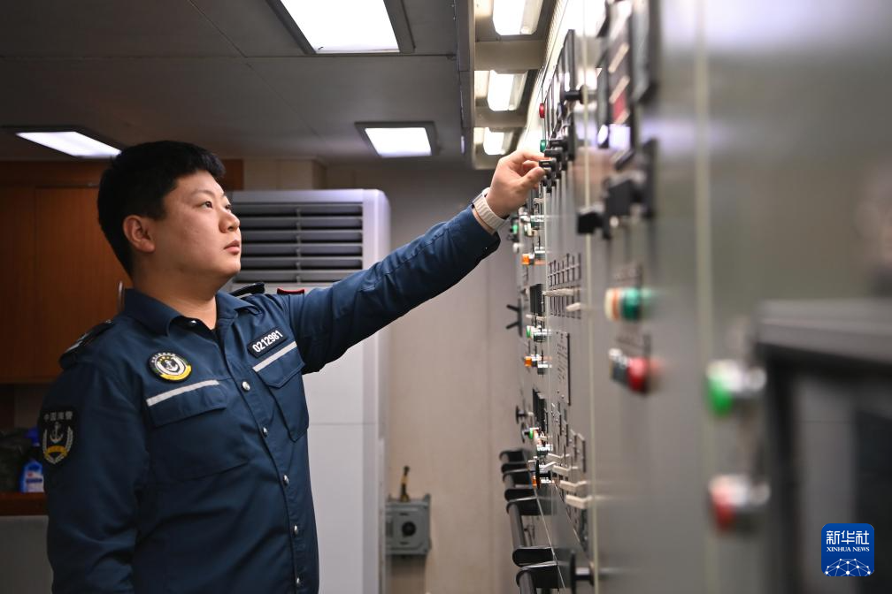2月12日,中国海警万山舰执法员刘春雨在机舱内操作配电板。