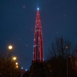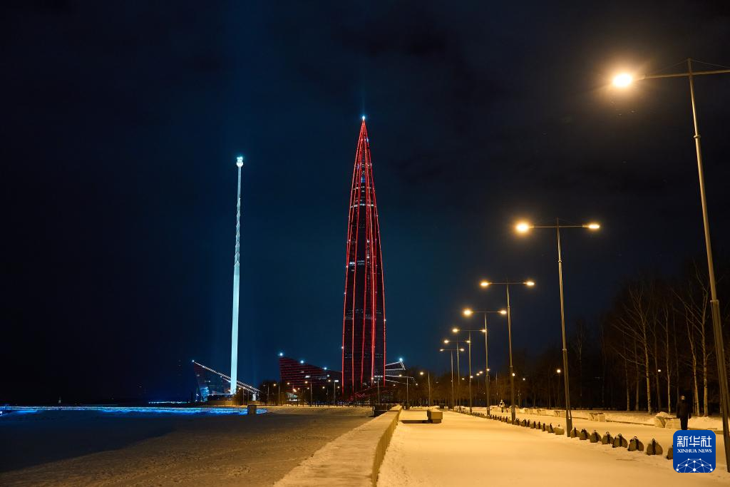 2月15日,在俄罗斯圣彼得堡,拉赫塔中心点亮“中国红”。