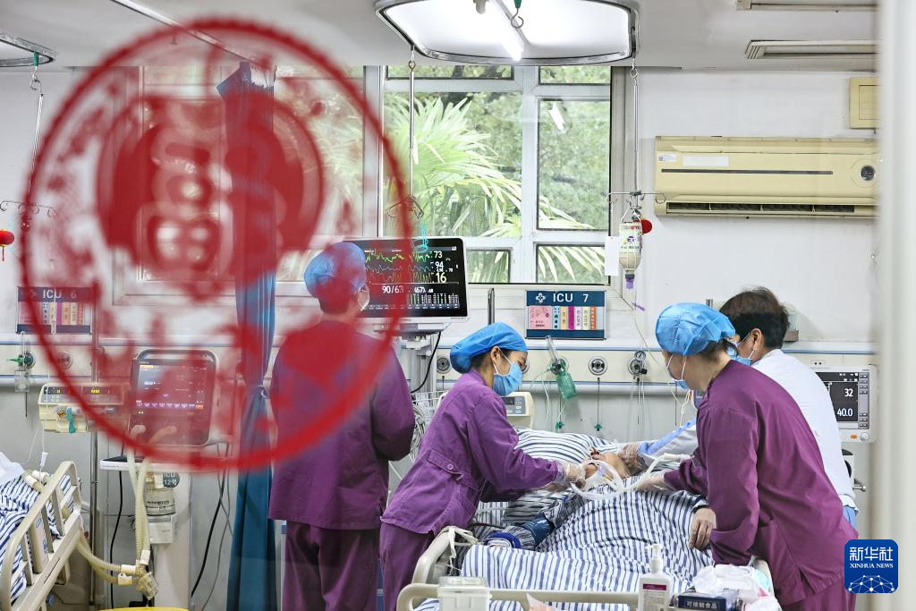 2月16日,在浙江省嘉兴市南湖区,海警医院重症监护室的医护人员为患者治疗。