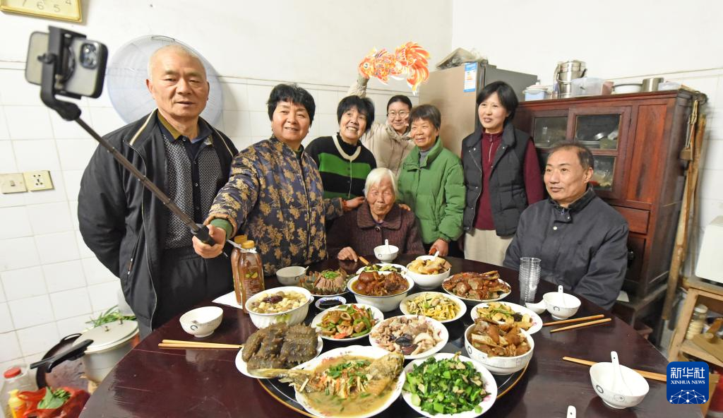 2月16日,浙江省永康市花街镇山后胡村的一家人在吃年夜饭。