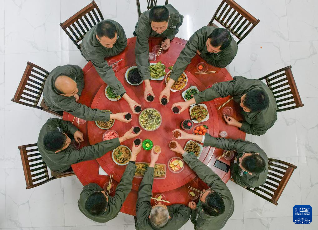 2月16日,在国网商丘供电公司会亭供电所,电力运维人员在餐厅一起吃年夜饭(无人机照片)。