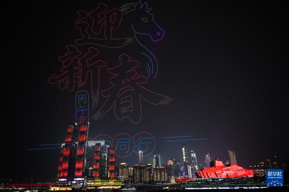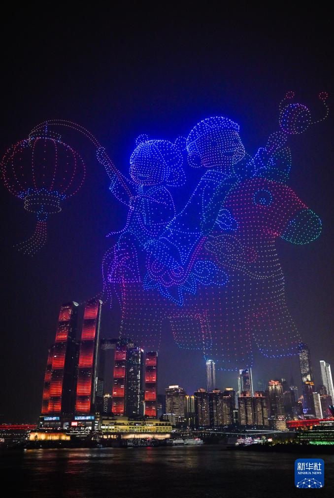 大年初一,“新韵重庆”无人机灯光秀在重庆夜空上演。无人机灯光队列组成各种创意图案,点亮夜空,为观众献上视觉盛宴。