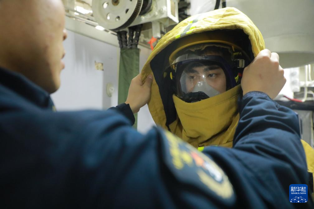2月15日,海军某潜艇支队官兵在穿戴防护服,准备进行损管演练。