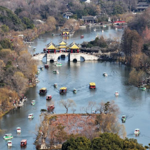 2月17日,江苏扬州瘦西湖风景区游人如织(无人机照片)。