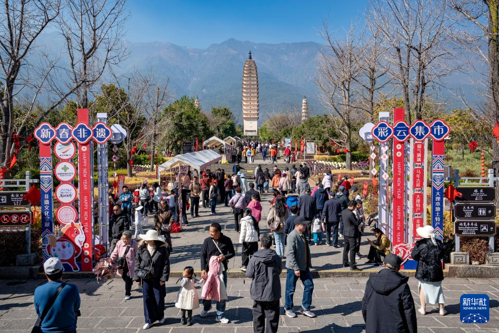 2月17日,游客在云南大理崇圣寺三塔文化旅游区游览。