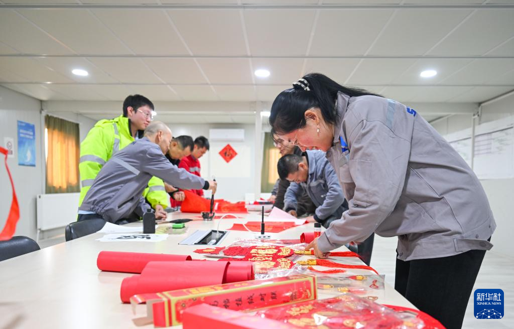 2月16日,在土耳其阿克萨拉伊省图兹湖地下天然气储库扩建项目二期工程营地,中工国际的职工在贴春联。