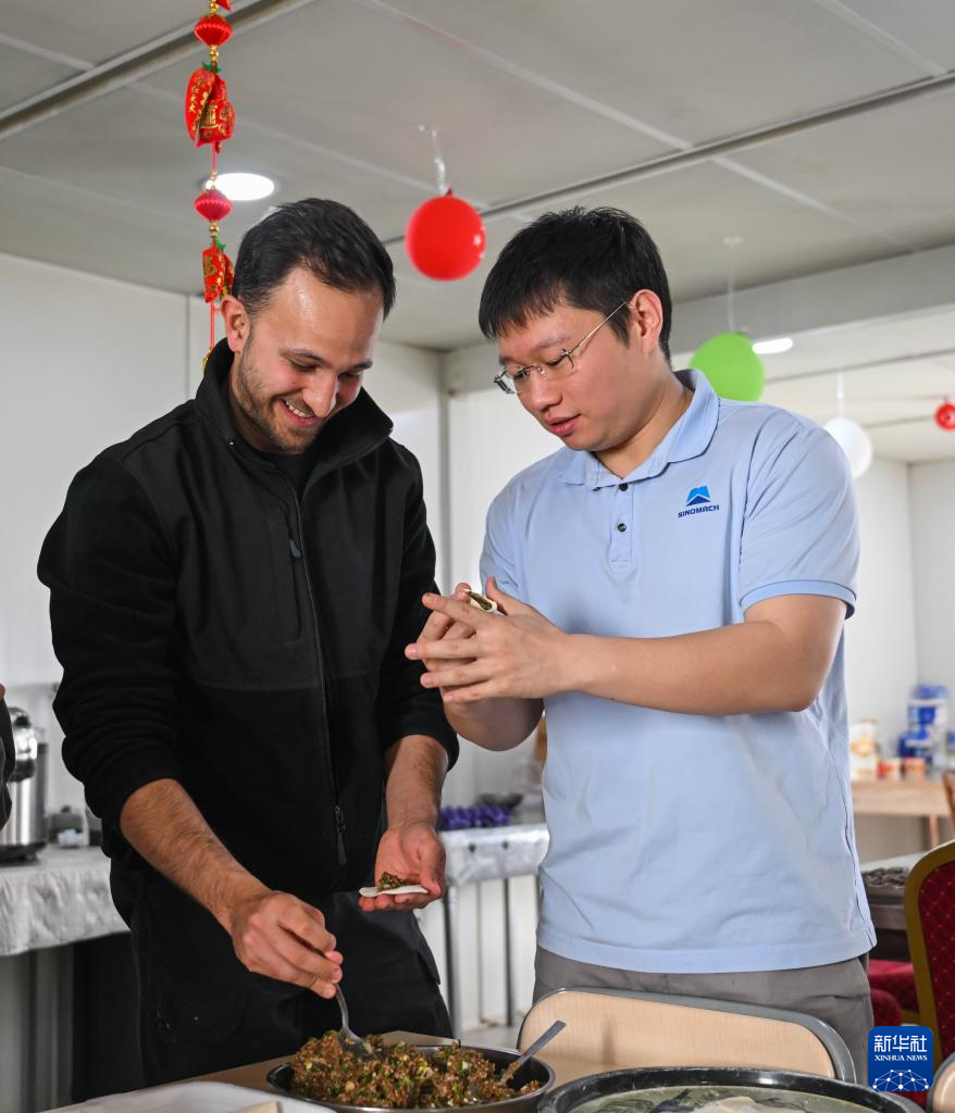 2月16日,在土耳其阿克萨拉伊省图兹湖地下天然气储库扩建项目二期工程营地,中土两国职工在一起包饺子。