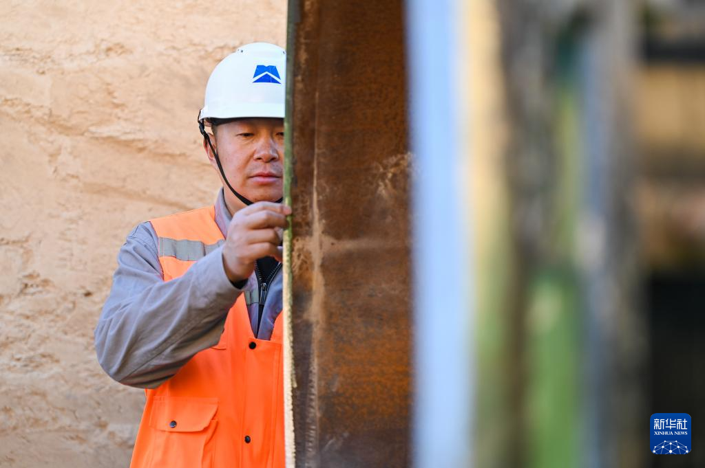 2月15日,在土耳其阿克萨拉伊省图兹湖地下天然气储库扩建项目三期工程施工现场,一名中工国际工作人员在查看管道接缝口。