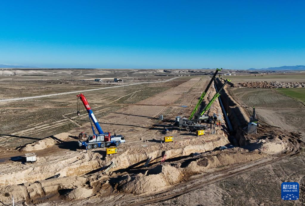 2月15日,在土耳其阿克萨拉伊省图兹湖地下天然气储库扩建项目三期工程施工现场,工程车辆在铺设管道(无人机照片)。