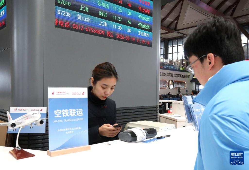 2月19日,在江苏苏州站候车大厅,旅客在东航“空铁联运”服务柜台办理值机托运。春运期间,苏州站启用东航“空铁联运”服务柜台,为搭乘高铁前往上海虹桥、浦东两大航空枢纽的中转旅客提供一站式值机服务。