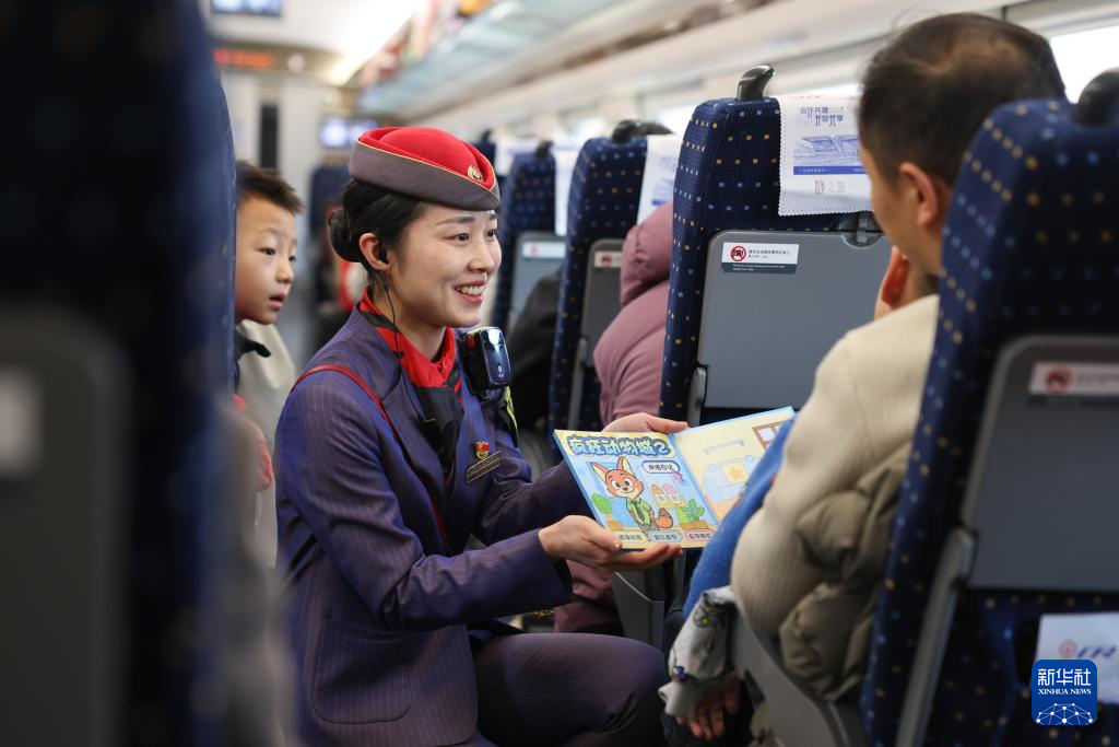 2月18日,在西安北开往武威东D2719次高铁列车的静音车厢,列车长用绘本贴图册引导小旅客安静乘车。