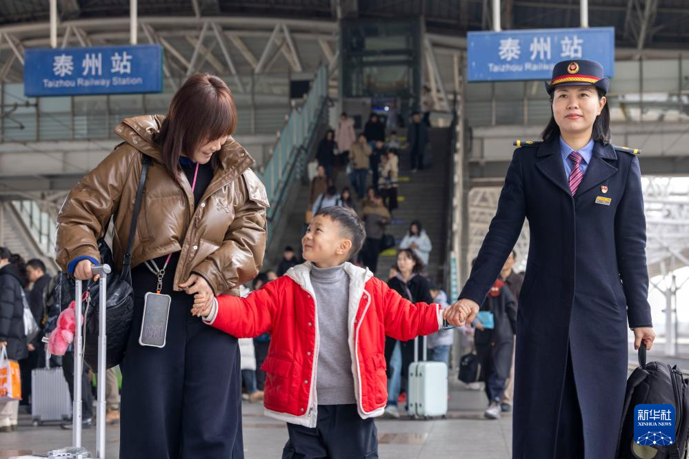 2月19日,江苏泰州站工作人员帮助旅客进站乘车。