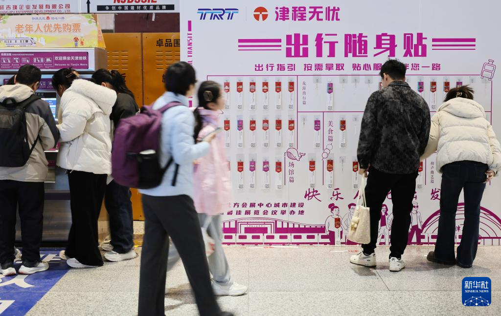 2月19日,在天津西站地铁站出入口处,乘客拿取出行随身贴。出行随身贴上标有地铁站附近的景点、美食、娱乐活动等信息,方便乘客出行参考。