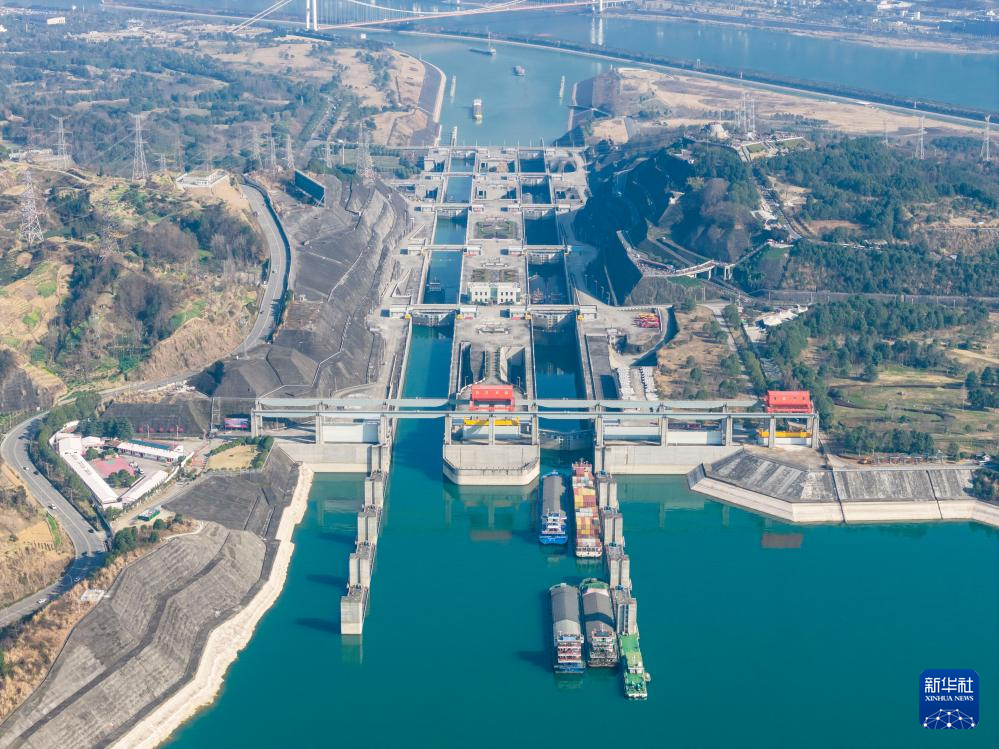 2月19日,在湖北宜昌,船舶有序通过长江三峡双线五级船闸(无人机照片)。