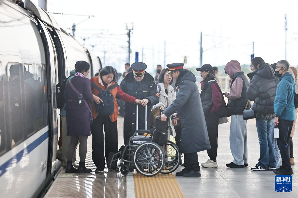 2月19日,在铁路浙江嘉兴南站站台,工作人员搀扶一名腿部受伤旅客下车坐上轮椅车,为其提供出站服务。