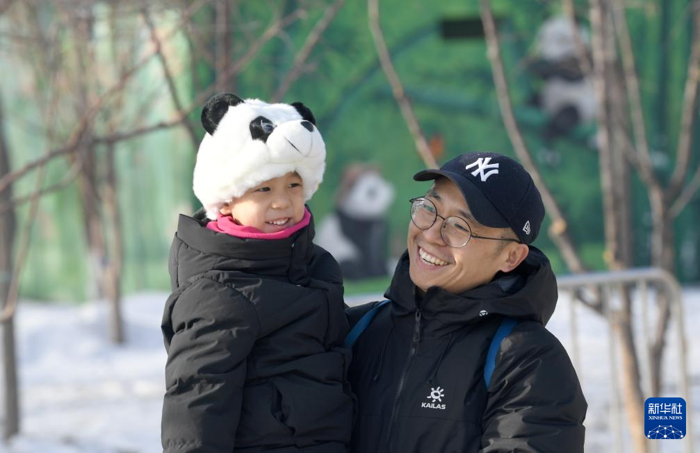 2月19日,一名头戴大熊猫棉帽的小游客准备进入大熊猫馆参观。