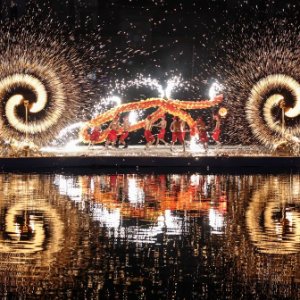 2月17日,民间艺人在湖北省襄阳市华侨城奇幻谷景区表演“火龙钢花”。