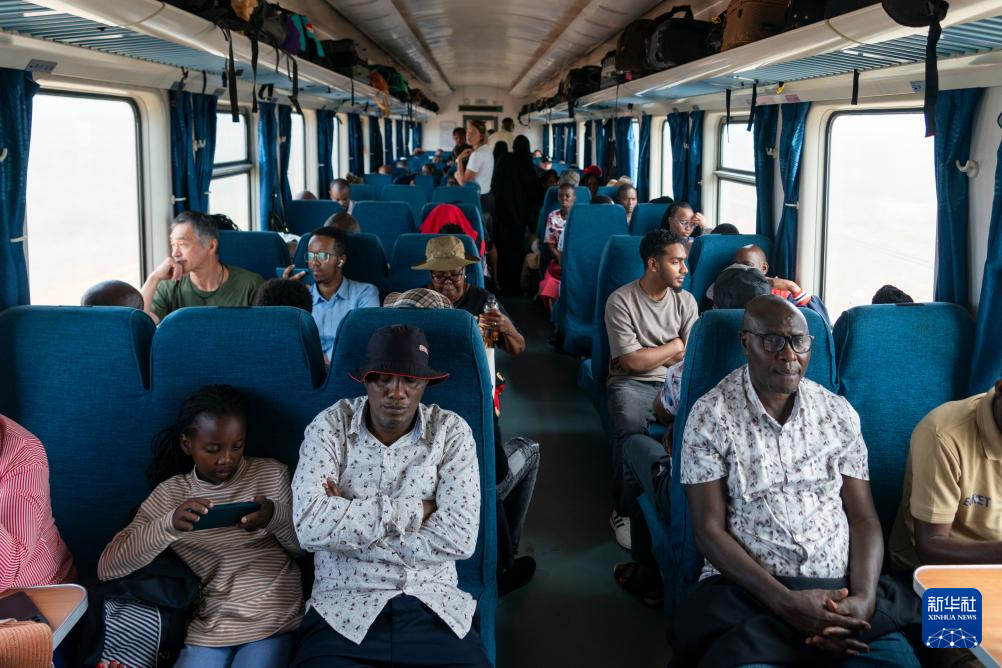 2月17日,旅客乘坐蒙内铁路客运列车从肯尼亚首都内罗毕前往蒙巴萨。