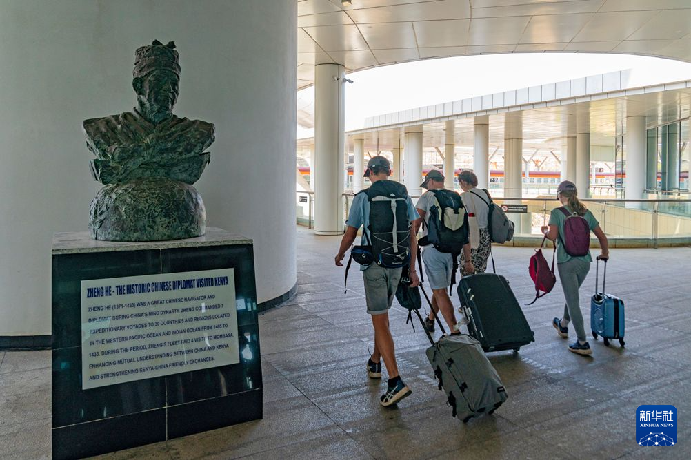 2月19日,在肯尼亚蒙巴萨的蒙内铁路蒙巴萨站,旅客进站乘车时经过明朝航海家郑和的雕塑。