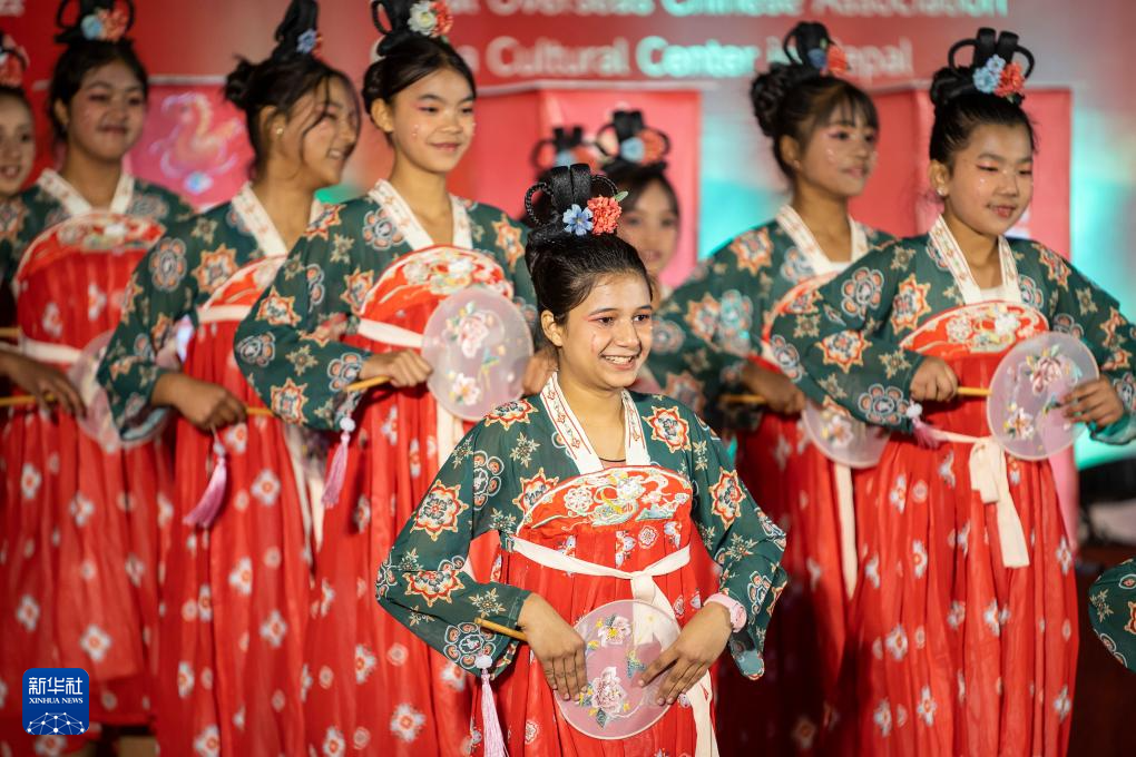 2月17日,在尼泊尔勒利德布尔,尼泊尔学生在中国新春灯会开幕式上表演中国舞蹈《唐宫夜宴》。