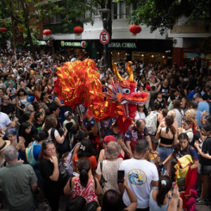 2月16日,在阿根廷首都布宜诺斯艾利斯中国城,人们在马年新春庙会上观看舞龙表演。