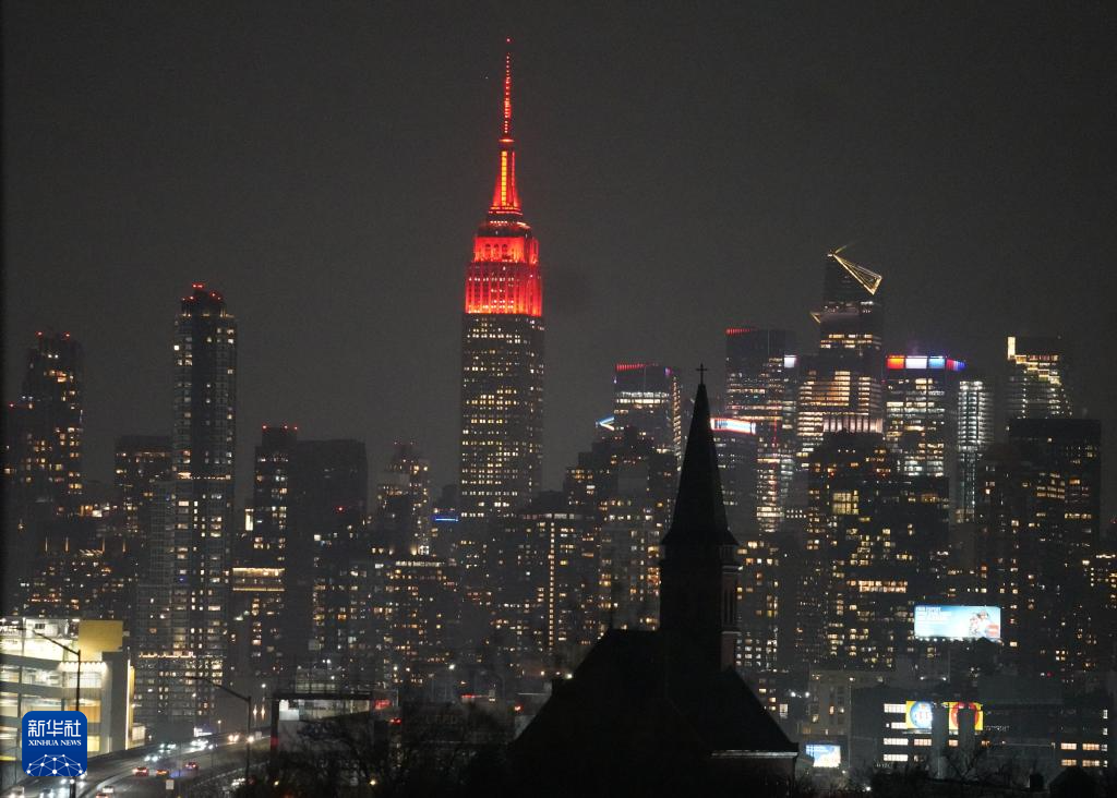 2月16日晚,美国纽约帝国大厦亮起中国春节主题灯光。