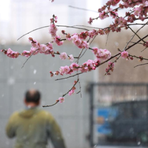 2月23日,在河南省安阳市内黄县街头,一名男子冒雪出行。