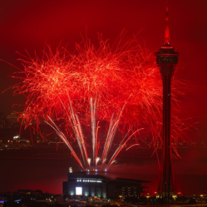 2月23日,澳门旅游局在澳门旅游塔对出海面举行“金骏云翔 欢乐春节”2026无人机烟花汇演第二场。