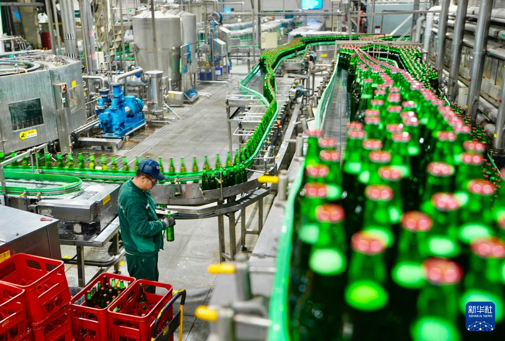 2月24日,工人在位于宁夏银川市贺兰县的宁夏西夏嘉酿啤酒有限公司包装车间检测封盖质量。