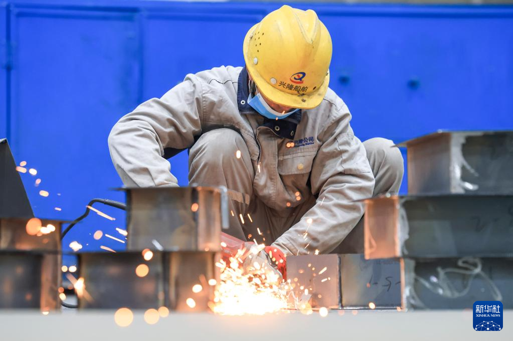 2月24日,江苏省泰兴市兴隆船舶机械有限公司工人在生产车间打磨机械配件。