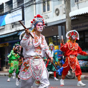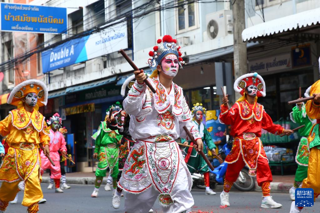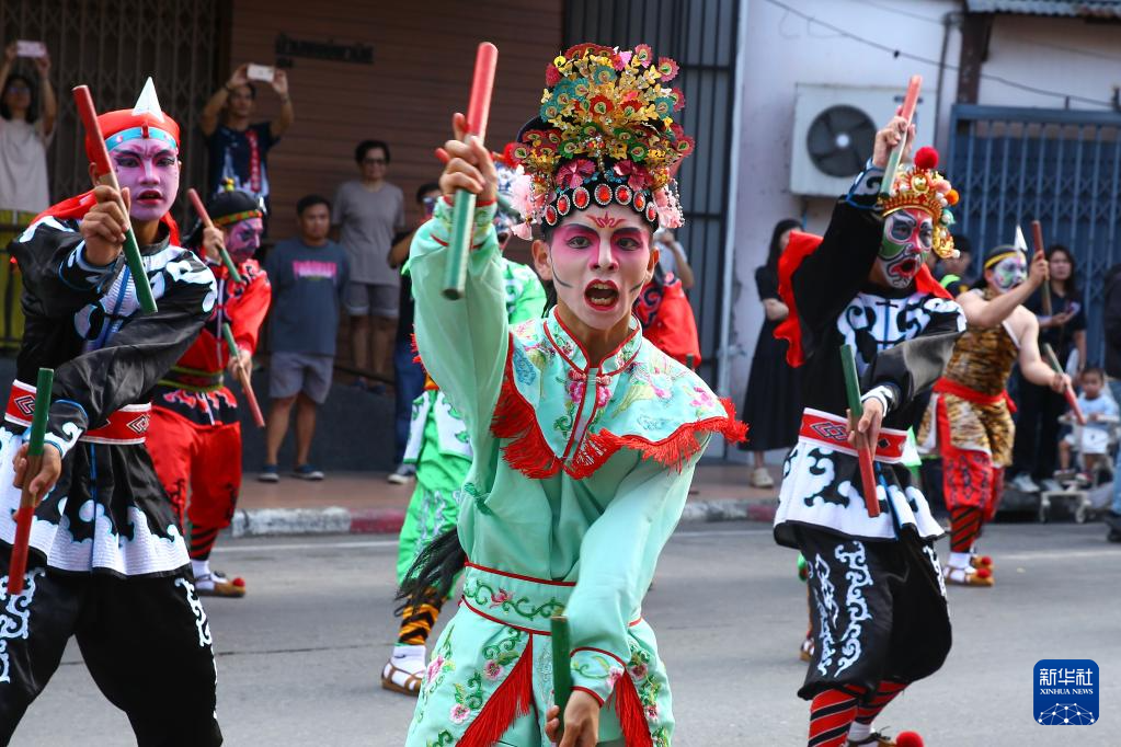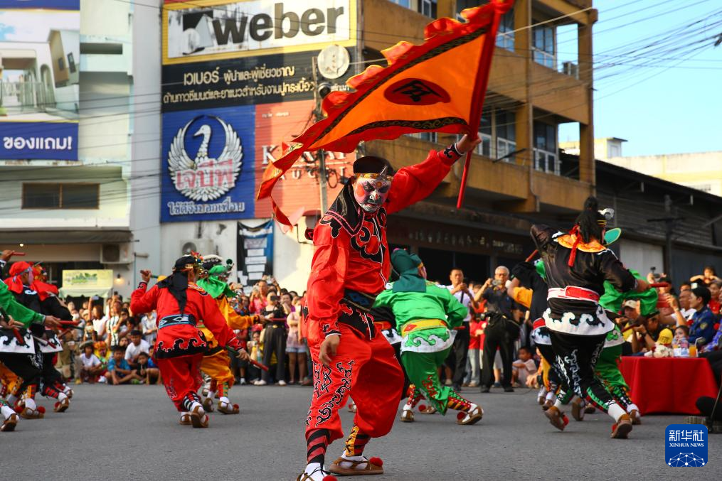 2月28日,中国广东普宁泥沟英歌队的表演者在泰国春武里府旧罔县演出。