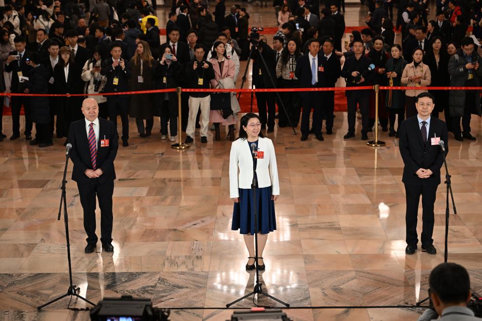 3月4日,全国政协十四届四次会议首场“委员通道”集体采访活动在北京人民大会堂举行。