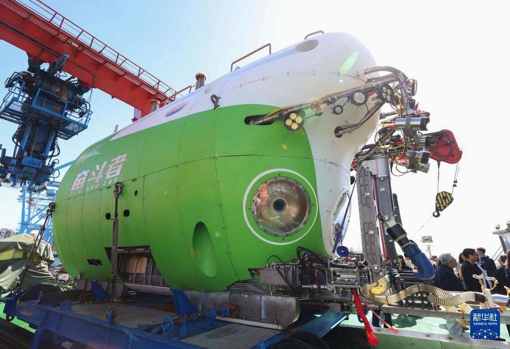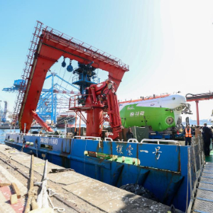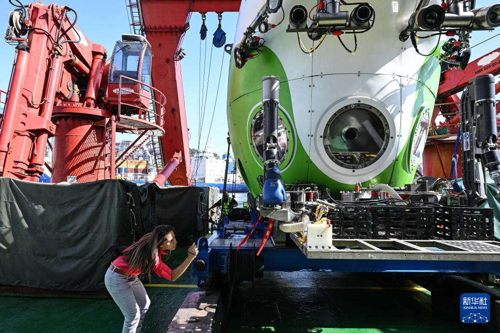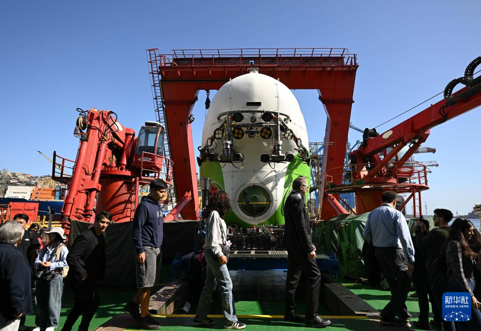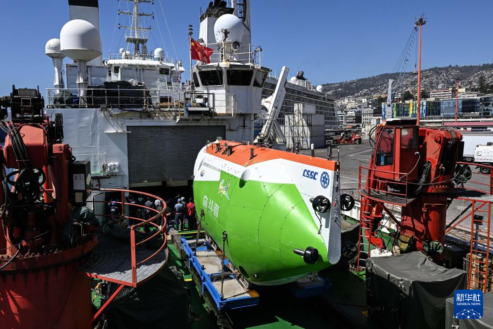 这是3月5日在停靠于智利瓦尔帕莱索的中国“探索一号”科考船上拍摄的“奋斗者”号载人潜水器。