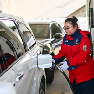 3月9日,在江苏省连云港市赣榆区一加油站,工作人员给汽车加油。